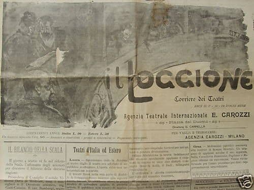 Il Loggione Corriere dei Teatri Milan, 15 giugno 1899 Cm.50x35, pp. 4, senza legatura. Interessante edizione originale antica e d'epoca di questo noto raro periodico milanese dedicato al mondo del teatro, e gestito dall'agenzia teatrale E. Carozzi, sotto la direzione di G. Cannella, con articoli su Il bilancio della Scala Teatri d'Italia ed estero (notiziario da Torino, Aquila, Roma, Palermo, Macerata, Chieti, Ravenna, Treviso, Parigi, Graz) Le ferrovie e gli artisti teatrali Opere nuove Nuove pubblicazioni Posta: con una corrispondenza da Palermo Quel che dicono ...gli altri (citati Emma Carelli, Giuseppe Borgatti, Linda Micucci, ...) Sforbiciature (con cronache varie dai teatri e su artisti teatrali) Rubriche varie e notiziari Scritturati e disponibili Con anche qualche inserizione pubblicitaria Bella intestazione figurata, con grande illustrazione raffigurante una scena da un loggione di teatro, siglato GB (?), probabilmente tratta da un dipinto di un artista di area lombarda della fine dell'800. Di interesse culturale specialistico teatrale bibliografico Discreta conservazione generale, segni e difetti d'uso o d'epoca, sparse fioriture, piegature e sgualciture, esemplare viaggiato per posta e pertanto ancora completa della affrancatura originaria. (eventuali altre informazioni a richiesta; l'immagine allegata raffigura un particolare della testata)
