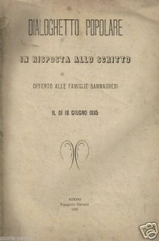 Dialoghetto popolare *In risposta allo scritto* *offerto alle famiglie sammauresi* *il dì 18 giugno 1885* S.i.t., (1885) Cm. 22,5; pp.48; senza legatura. Interessante antica e rara edizione originale e d'epoca, curiosa edizione riminese con all'interno un dialoghetto tra un artiere e un reverendo, reverendo che si firma alla fine Luigi Trevisani. Di interesse culturale, storico locale e bibliografico *rarissima edizione originale e d'epoca, **nessun esemplare noto** nel sistema bibliotecario nazionale italiano.* Modesta conservazione generale, segni e difetti d'uso e d'epoca, segni di sporco e graffi alle carte finali, esemplare senza legatura o copertine e pertanto meritevole di rilegatura.