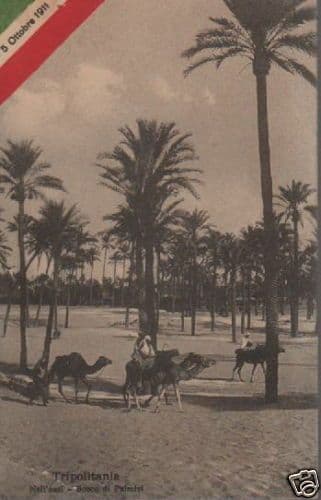 Tripolitania Nell'oasi: bosco di palmizi Bella veduta originale e d'epoca, datata 5 ottobre 1911, con cammelli presso un'oasi in Tripolitania. Cartolina antica, del periodo coloniale, misura cm. 9x14 circa, non viaggiata per posta; eliocromia Fumagalli & C. (Milano) Da collezione per le varie tematiche collegate *Africa, colonie, militaria, fotografia, deserto, cammelli, tricolore, Grande Guerra,...* Discreta conservazione generale, segni e difetti d'uso e d'epoca, piegatura ad un angolo; ***meritevole anche di essere inserita sotto passpartout ed incorniciata***. * * * Il 07-ott-09 alle 18:03:48 CEST, il venditore ha aggiunto le seguenti informazioni sull'oggetto: Preferito il pagamento con bonifico bancario, a richiesta eventuali altre modalità; l'opzione di pagamento con paypal è valida prevalentemente per i Paesi extraeuropei, la sua accettazione potrebbe comportare l'aggiunta delle relative spese, mentre la spedizione sarà fatta solo dopo l'avvenuto trasferimento dei relativi fondi: a richiesta eventuali altre informazioni.