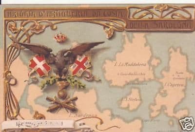 Brigata d'Artiglieria da Costa della Sardegna Interessante antica bellissima cartolina illustrata, raffigurante una allegoria con stemma araldico e un'aquila, e una schematica cartografia di parte della Sardegna e delle isole prospicienti tra cui la Maddalena, Caprera, S. Stefano. Stampa antica cromolitografica a colori con anche dorature, misura circa cm. 9x14; non viaggiata per posta; databile primo fine '800 o '900. Di interesse artistico, storico e militare e collezionistico Buona conservazione generale, segni e difetti d'uso e d'epoca, abrasione nella zona per il francobollo; meritevole anche di essere inserita sotto passpartout ed incorniciata. * * * Il 02-ott-09 alle 10:19:20 CEST, il venditore ha aggiunto le seguenti informazioni sull'oggetto: L'acquisto deve essere confermato dall'invio del pagamento entro tre giorni; è preferito il pagamento con bonifico bancario, altre modalità (vaglia postale, paypal, e altro) solo a richiesta; ulteriori informazioni sulle spese di spedizione e imballaggio sono da richiedere solo prima della scadenza dell'asta; ogni spedizione viaggia ad esclusivo rischio dell'acquirente (a richiesta l'eventuale invio assicurato); non si accetta recesso senza pre-accordo essendo l'oggetto rispondente pienamente alla descrizione in asta, e pertanto ogni eventuale altra informazione deve essere richiesta esclusivamente prima della scadenza dell'asta. Grazie per l'attenzione!