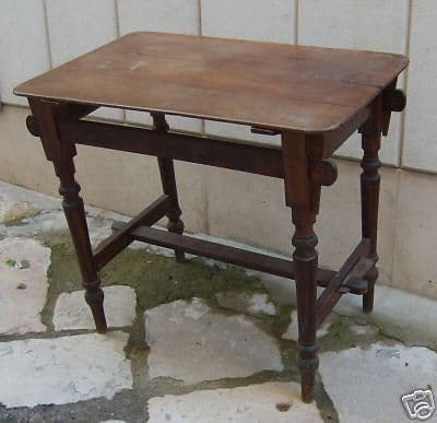 Interessante vecchio tavolino in legno, di belle giuste dimensioni, utile anche da viaggio essendo completamente smontabile, con gli incastri tenuti da zeppe in legno, rimovibili per il trasporto. Misura circa cm. 54,5x88,5 (piano); cm.79 (altezza); legno di pino (?) color noce; databile anni '30      Utile per qualsiasi arredo e di bell'effetto decorativo Buona conservazione generale, segni e difetti d'uso e d'epoca, sparsi segni di tarlo, struttura un pò allentata, piano in tre pezzi, abrasioni o ammaccature sparse, degno di restauro; il tavolo è smontabile tranne che per le due coppie dei piedi che fanno da montanti, sui quali poi si innestano le varie traverse e il piano. *(a richiesta eventuali altre informazioni)*