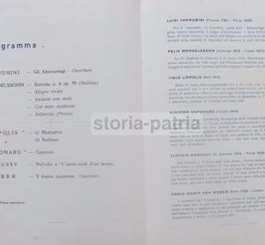 Concerti sinfonici di primavera*\n\nGrande sala del Conservatorio, *Napoli*\n\nDirettore **Luigi Colonna**\n\nEdizione originale del 1936. Foglio volante pubblicitario della manifestazione svoltasi nel maggio 1936.\n\n Secondo concerto sinfonico diretto da **Luigi Colonna.\n Partecipazione dell'orchestra del R. Conservatorio.\n Programma musicale: brani di Cherubini, Mendelssohn, Lippolis, Saponaro, Debussy, Weber.\n Elenchi dei promotori, soci benemeriti e sostenitori.\n Schede biografiche dei compositori, inclusi i pugliesi Saponaro (Fasano) e Lippolis (Bari).\n* Formato: Foglio unico piegato (4 pagine), 24,5x17 cm circa.\n\nDiscreta conservazione generale con segni d'uso e d'epoca, fioriture sparse, piegature e lievi sgualciture marginali come da documentazione fotografica.