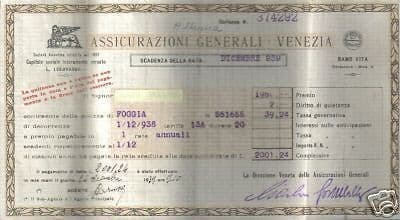 **Assicurazioni Generali** **Venezia** **Interessante antica quietanza di pagamento di rata assicurativa emessa e sottoscritta dall'agente di zona (pugliese) nel 1939.** **Cm.11,5x21,5** Di interesse collezionistico per le varie tematiche collegate Buona conservazione generale, usuali segni e difetti d'uso e d'epoca, piegature.