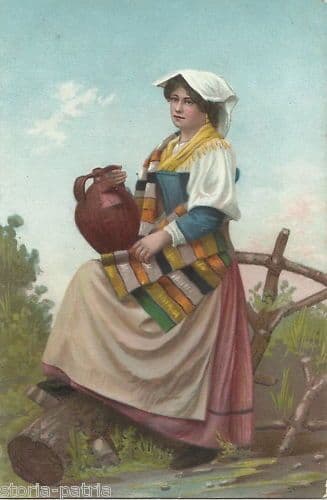 Decorativa e folcloristica Bella antica veduta, raffigurante una donna in abito tradizionale locale, vesti e scialle a bande colorate e tipico copricapo, con in braccio una anfora per il trasporto dell'acqua, costume probabilmente ascrivibile alla tradizione locale laziale, acquaiuola forse della campagna romana o della Ciociaria (?); *stampa antica cromolitografica a colori, ad uso e formato cartolina, misura circa cm. 14x9; impressa su cartoncino leggero, ed edita da Stengel & Co. (Dresda); con al verso intestazione plurilingue, mai usata né spedita per posta; databile presumibilmente al primo '900.* Di interesse folklorico, storico-locale, collezionistico, artistico, decorativo Buona conservazione generale, segni e difetti d'uso e d'epoca, usuali difetti o usura marginale, ma complessivamente molto ben conservata e **meritevole di essere inserita sotto passepartout ed incorniciata.**