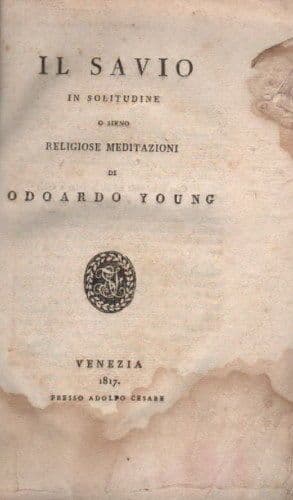 ODOARDO YOUNG IL SAVIO IN SOLITUDINE *O SIENO RELIGIOSE MEDITAZIONI* Venezia, Adolfo Cesare, 1817. Cm.21, pp.106, senza legatura. Interessante antica edizione d'epoca, curiosa raccolta di dodici sacre meditazioni, per le varie ore del giorno, ossia *IDDIO CREATORE* *PENSIERI PER LA MATTINA* *DIO ETERNO* *PENSIERI PER LA SERA* *LA ONNIPOTENZA DI DIO* *IL LEVAR DEL SOLE* *LA INFINITA SAPIENZA DI DIO* *IL TRAMONTAR DEL SOLE* *LA INFINITA BONTA' DI DIO* *IL MATTINO* *LA PROVVIDENZA* *LA SERA* OPERA DI INTERESSE CULTURALE, SPECIALISTICO, DEVOZIONALE, BIBLIOGRAFICO Modesta conservazione generale, segni e difetti d'uso e d'epoca, ampie gore e sparse fioriture, antichi visibili segni di umido che in molte pagine ha sfaldato marginalmente la carta, pertanto fogli meritevoli di restauro o è possibile anche la rifilatura del volume essendo ancora a larghi margini intonsi; esemplare senza legatura o copertine e pertanto meritevole di rilegatura. *(l'immagine allegata raffigura un particolare dell'intero frontespizio, eventuali altre informazioni a richiesta)*