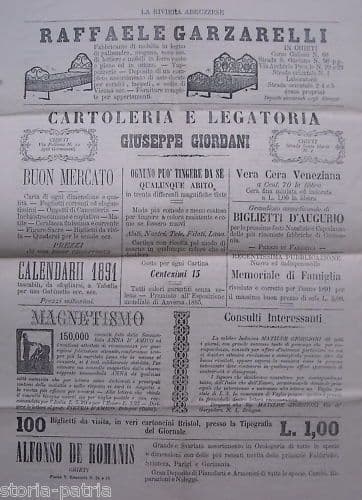 La Riviera Abruzzese *Periodico politico letterario amministrativo* Chieti, 29 novembre 1890 Cm.50x35 circa; pp.4 Interessante edizione originale antica e d'epoca, raro giornale abruzzese, diretto da Francesco Battaglini, edito in Chieti, con scritti di interesse storico-locale, politico, economico, documentario, e in particolare in questa edizione evidenziamo: *Dopo le elezioni* *Un museo lungo una scalinata* *Post Bellum* *Necrologio per la morte di Ariodante Mambelli (di Atri, docente in Puglia, a Lucera)* *Risultato delle elezioni negli Abruzzi* *Bovio di Francavilla* *L'orgia di Francavilla* *Cavalleria rusticana in Ancona* *(Rubriche varie)* Come d'uso la quarta pagina era riservata alle inserzioni pubblicitarie, sempre di grande interesse per la storia economica e folklorica del territorio, contenente spesso pubblicità locali oltre ad altre più generali, tra esse: *Mobilificio Garzarelli in Chieti (con anche illustrazioni di antichi letti in ferro)* *Cartoleria legatoria Giordani in Chieti* *Orologeria De Romanis in Chieti* *....* Di interesse storico-locale, pubblicitario, collezionistico, bibliografico *(questi fogli periodici sono quasi sempre di grandissima rarità, essendo spesso editi in tirature molto limitate, per una ristretta cerchia di lettori locali, spesso facilmente alienati dopo la lettura, quasi mai conservati come i libri, e pertanto di estrema rarità bibliografica e collezionistica)* Discreta conservazione generale, segni e difetti d'uso e d'epoca, piegature e sgualciture e difetti vari marginali. *(l'immagine allegata raffigura un particolare dell'intero giornale, eventuali ulteriori informazioni a richiesta)* [](https://imageshack.us/photo/my-images/822/riviera5b.jpg/ "ImageShack - Image And Video Hosting")Uploaded with [ImageShack.us](https://imageshack.us/)