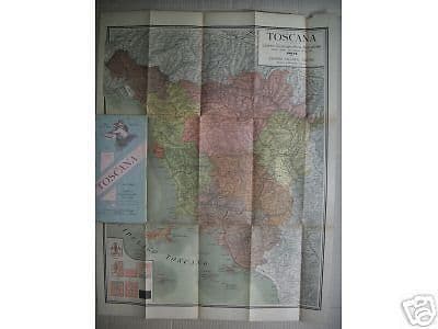 Grande ed inusuale antica cartografia delle regioni dell'Italia centrale, in particolare della Toscana ma con ampia descrizione anche delle regioni o territori confinanti, come Lazio, Umbria, Romagna, Liguria (con La Spezia) Carta corografica stradale, edita dal Vallardi (Milano), nel 1894 *Nata come carta stradale, è ben dettagliata la descrizione della viabilità stradale e ferroviaria, ma notevole è anche la ricchezza dei toponimi citati, città e paesi e altre località molte delle quali probabilmente ora non più esistenti o ridenominate e per le quali è impossibile dare la pur minima indicazione essendo più specificatamente compito dello studioso di storia locale, per la sua più specifica ed approfondita conoscenza del proprio territorio.* *Ben in evidente anche tutta l'* *Isola d'Elba* *ma anche Pianosa Montecristo l'Isola del Giglio Giannutri* *e il* *Promontorio dell'Argentario* *ancora evidenziabili anche le paludi di Grosseto* Bella presenza degli stemmi araldici delle principali provincie toscane Firenze Grosseto Lucca Livorno Massa Pisa Siena Di interesse geografico, storico-locale, collezionistico, decorativo Stampa cromolitografica a colori, di grandi dimensioni; misura cm.71x55; buona conservazione generale, piccola mancanza al margine sup., difetti alle varie piegature, inevitabili in carte di tali dimensioni, nate per essere portatili e da viaggio; quando ripiegata è protetta da una copertina originale figurata (difetti), che può essere rimossa nel caso di debba procedere all'incorniciatura le grande foglio.