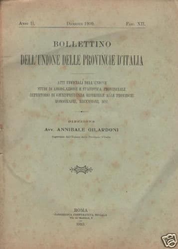 BOLLETTINO DELL'UNIONE DELLE PROVINCIE D'ITALIA *ATTI UFFICIALI DELL'UNIONE* *STUDI DI LEGISLAZIONE E STATISTICA PROVINCIALE* *REPERTORIO DI GIURISPRUDENZA RIFERIBILE ALLE PROVINCIE* *MONOGRAFIE, RECENSIONI, ECC.* Dic. 1909 (Anno II, fasc. XII) Roma, Tip. Coop. Sociale, 1910 Cm.25 , pp. (da pag.337 a pag. 368), bross. edit. (difetti) Interessante pubblicazione periodica diretta da Annibale Gilardoni, dove sono presenti notizie relative a: *IL NUOVO MINISTERO E L'UNIONE DELLE PROVINCIE* *LE PRESTAZIONI IMMOBILIARI DI CASERMAGGIO DEI REALI CARABINIERI* *LE TASSE SUI VELOCIPEDI, MOTOCICLI E AUTOMOBILI E L'UNIONE DELLE PROVINCIE* *ISTITUZIONE DELLE CASSE PROVINCIALI DI CREDITO AGRARIO NEL MEZZOGIORNO* *MANUTENZIONE STRADALE* *....* *I PERIODI DI CACCIA NELLE PROVINCIE D'ITALIA* *ELEZIONI PROVINCIALI, MAESTRI ELEMENTARI, ...* *I PROBLEMI TECNICI ED AMMINISTRATIVI DELLA MANUTENZIONE STRADALE* *Citate numerose località italiane, da Udine alla Sardegna alla Sicilia,....e le numerosissime località interessate dalla durata della caccia, caccia sia con fucile che con rete.* DI INTERESSE CULTURALE, SPECIALISTICO E BIBLIOGRAFICO Buona conservazione generale, segni e difetti d'uso e d'epoca, difetti al dorso della brossura, sgualciture, diffuse fioriture, esemplare ancora a fogli chiusi, slegato ed eventualmente meritevole di rilegatura.