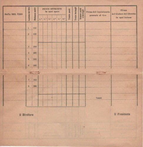 Da collezione! Interessante antica scheda, utile per annotare i punteggi ottenuti nelle gare di tiro con armi da fuoco, con suddivisioni relative alla data del tiro, lezione, distanza, punti ottenuti in ogni sparo, totale punti e bersagli, firma del commissario presente al tiro e firma del tiratore; misura circa cm. 21x21,5 (l'intero foglio); foglio sciolto impresso al recto e al verso, scheda che probabilmente in origine doveva far parte di un libretto specifico del tiratore; databile alla prima metà del '900. Di interesse specialistico e collezionistico Buona conservazione generale, segni e difetti d'uso e d'epoca, piegatura centrale con segni di vecchia cucitura (per essere stato originariamente rilegato ad un libretto); **meritevole anche di essere inserito sotto passpartout ed incorniciato.**