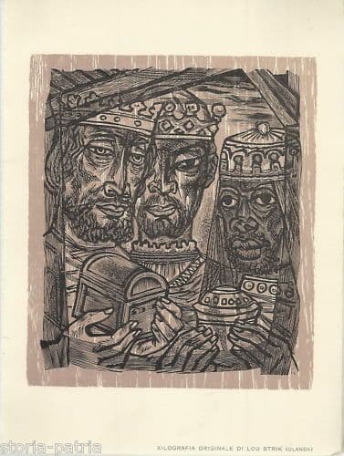 Lou Strik Interessante raffigurazione dei Tre Re Magi, con in mano i loro scrigni per i doni per la Natività, illustrazione eseguita dall'autore artista olandese Lou Strik, e utilizzata da Gianni Mantero per un cartoncino-pieghevole augurale natalizio (per il Natale 1957 e per il capodanno del 1958); xilografia originale, misura circa cm. 16x12 (l'intero foglio, compresi i margini bianchi diseguali); stampa impressa in prima pagina di un pieghevole di 4 pagine (interno bianco), in quarta pagina vi è impressa la scritta augurale del Mantero, noto collezionista di incisioni e exlibris. Di interesse artistico e collezionistico Buona conservazione generale, segni e difetti d'uso e d'epoca, sgualciture o difetti vari marginali, **stampa meritevole anche di essere inserita sotto passpartout ed incorniciata.**