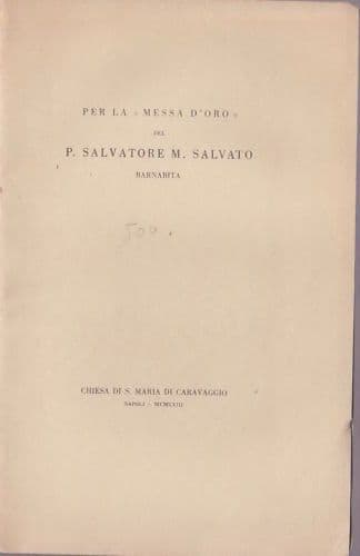 Per la Messa d'Oro del P. Salvatore M. Salvato Barnabita Napoli, Chiesa S. Maria di Caravaggio, 1958 Cm.21,5; pp. 29; bross. edit. Interessante edizione d'epoca, pubblicazione a cura dei PP. Barnabiti di Caravaggio, che non potendo essere presenti alla celebrazione delle Nozze d'Oro del Salvato, affidano un messaggio al Rettore del Collegio Bianchi P. Cilento, quale canto al Sacerdozio e in segno di commozione; *nel corso dell'elogio troviamo riferimenti ai fanciulli e orfani di Gioia del Colle (Puglia), Collegio Bianchi, S. Ignazio, Antonio M. Zaccaria, P. Gennaro Ricotti, Livorno, Perugia, Salonicco, Padre Falcone, Collegio S. Luigi;* *al messaggio di P. Vincenzo Cilento segue il ringraziamento di P. Salvato, che cita anche i collegi napoletani Bianchi e Denza (Posillipo) e S. Giuseppe di Pontecorvo, mons. D'Arco vescovo di Castellammare, mons. Marena vescovo di Ruvo e Bitonto, mons. Rinaldi vescovo di S. Marco e Bisignano,...* Di interesse storico-locale, specialistico, bibliografico Buona conservazione generale, usuali segni o difetti d'uso e d'epoca, ma elegante edizione molto ben conservata.