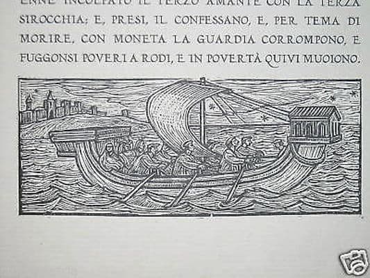 BOCCACCIO LA NOVELLA DELLE TRE SORELLE E DEI TRE GIOVANI Urbino, Ist. d'Arte, 1939 Cm.31, pp. 19, bross. edit. Interessante antica e rara edizione originale e d'epoca, bellissimo esempio di arte tipografica, curato da Egidio PECORARI, autore sia delle belle e artistiche incisioni in legno (xilografie) sia dell'impostazione grafico-tipografica del testo per il quale ha utilizzato gustosi ed eleganti caratteri; *opera impressa su carta vergellata, con fogli a larghi margini, con il testo impreziosito da ben 15 xilografie originali, ad illustrazione della novella tratta dal Decamerone,* *nel cui testo sono citate le località della Grecia, Creta e Rodi, ma anche la provenza e Marsiglia, Genova, la Candia;* *fregi xilografici incisi sulle copertine, raffiguranti tre cuori rossi e un serpente, e tre cuori e una spada;* *opera edita in tiratura limitatissima e numerata, per bibliofili!* DI INTERESSE CULTURALE, GRAFICO, TIPOGRAFICO, LETTERARIO, ARTISTICO, BIBLIOGRAFICO Buona conservazione generale, segni e difetti d'uso e d'epoca, sparse fioriture, sgualciture alle copertine. *(l'immagine allegata raffigura un particolare di una pagina illustrata)*
