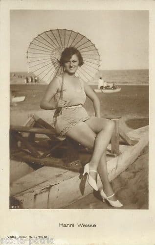 # Hanni Weisse Bella antica e rara foto-cartolina originale, raffigurante la nota attrice del cinema tedesco, in riva al mare; misura circa 14x9; Ediz. Ross (Verlag)- Bellerini e Fratini (Firenze), databile alla prima metà del '900 Di interesse fotografico, cinematografico, collezionistico Buona conservazione generale, usuali segni o difetti d'uso o d'epoca, non viaggiata per posta, **meritevole anche di essere inserita sotto passpartout ed incorniciata.** **#####** *Hanni Weisse (\** [*16. Oktober*](https://de.wikipedia.org/wiki/16._Oktober "16. Oktober") [*1892*](https://de.wikipedia.org/wiki/1892 "1892") *in* [*Chemnitz*](https://de.wikipedia.org/wiki/Chemnitz "Chemnitz")*; †* [*13. Dezember*](https://de.wikipedia.org/wiki/13._Dezember "13. Dezember") [*1967*](https://de.wikipedia.org/wiki/1967 "1967") *in* [*Bad Liebenzell*](https://de.wikipedia.org/wiki/Bad_Liebenzell "Bad Liebenzell")*; gebürtig Hanni Klara Therese Weisse), war eine deutsche* [*Schauspielerin*](https://de.wikipedia.org/wiki/Schauspieler "Schauspieler")*. Sie war eine der großen Stummfilmdiven und konnte ihren Star-Status bis in die 1920er Jahre halten.* *Sie erhielt eine Ausbildung im Cello-Spiel und trat erstmals 1910 als Chorsängerin am Berliner Thalia-Theater auf. 1912 war Weisse Ensemblemitglied des Königlichen Belvedere Dresden, das eine Tournee durch ganz Deutschland unternommen hatte, die auch nach* [*Berlin*](https://de.wikipedia.org/wiki/Berlin "Berlin") *führte. Dort lernte sie zufällig den Filmregisseur* [*Max Mack*](https://de.wikipedia.org/wiki/Max_Mack "Max Mack") *kennen, der sie für die Produktionsgesellschaft* [*Vitascope*](https://de.wikipedia.org/wiki/Vitascope "Vitascope") *engagierte. Sie debütierte in Macks Kurzfilm Die Zigeunerin und spielte auch in seinem Film* [*Der Andere*](https://de.wikipedia.org/wiki/Der_Andere_\(1913\) "Der Andere (1913)")*. Dieser von* [*Paul Lindau*](https://de.wikipedia.org/wiki/Paul_Lindau "Paul Lindau") *nach seinem Bühnenstück verfasste Film gilt als einer der ersten deutschen Stummfilme, die von der Kritik künstlerisch und schauspielerisch anerkannt wurden.* *Seit den 30er Jahren, als ihre Filmrollen allmählich kleiner wurden, verstärkte sie ihre Theaterarbeit und gab unter anderem Gastspiele am* [*Theater am Schiffbauerdamm*](https://de.wikipedia.org/wiki/Theater_am_Schiffbauerdamm "Theater am Schiffbauerdamm") *und am* [*Lessingtheater*](https://de.wikipedia.org/wiki/Lessingtheater_\(Berlin\) "Lessingtheater (Berlin)")*. 1942 drehte Weisse ihren letzten Film Vom Schicksal verweht und zog sich danach aus dem Filmgeschäft zurück. Insgesamt spielte sie in rund 100 Filmen mit.* *Nach ihrem Rückzug aus der Filmwelt eröffnete sie mit ihrem zweiten Mann das Hotel-Restaurant Herrenhaus bei* [*Aussig*](https://de.wikipedia.org/wiki/Aussig "Aussig")*. Von dort vertrieben, siedelte sie sich 1945 nahe* [*Dresden*](https://de.wikipedia.org/wiki/Dresden "Dresden") *an und eröffnete dort ihr Lokal Sängerhöhe. Im Jahr 1948 ging sie nach Westdeutschland und eröffnete in* [*Frankfurt am Main*](https://de.wikipedia.org/wiki/Frankfurt_am_Main "Frankfurt am Main") *eine Kneipe. Sie war auch Besitzerin des Hotel-Restaurants Zum Heidelberger, das sich zu einem Künstlertreff entwickelte. (dal web, wiki)*