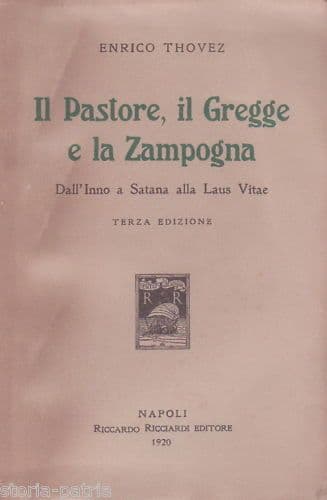Enrico Thovez Il pastore, il gregge e la zampogna *Dall'inno a Satana alla Laus Vitae* Napoli, Riccardo Ricciardi, 1920 Cm.19, pp.390, bross. edit. (difetti) Interessante antica edizione d'epoca, grosso volume impresso dal noto e colto stampatore napoletano Ricciardi, con un brano introduttivo di Zarathustra, e ampia trattazione di cui ovviamente è impossibile dare una adeguata sintesi, soprattutto per la vastità delle tematiche, ma anche per essere il volume ancora a fogli chiusi, e pertanto solo estrapolando dagli indici segnaliamo alcuni capitoli o riferimenti a *L'amoroso carroccio* *Il ratto d'Europa* *Il quirite e l'ebreo* *Il nazionalismo integrale* *Dal Leopardi ad Orazio* *La secrezione mucosa* *Il presente e il passato* *Dio e Satana* *La lirica e la patria* *L'Arcadia patriottica* *La questione morale* *Il banchetto funebre* *La fama* *....* *La ricerca della modernità* *Dal bordello all'ideale* *Il camaleonte* *Il mio e il tuo* *La truffa del sentimento* *L'Arcadia della bontà* *....* *Mimmermo* *Alcmane* *Pindaro, l'impressionista* *La forma e le formule* *Poesia di sostanza e poesia di forma* *La sovranità delle immagini* *Lingua fossile* *La ragione poetica* *Le odi barbare* *L'arte sana* *Laus Vitae* *Il vangelo della gioia* *Le pulci di Dante* *La poesia in redingote* *....* *Dai cani da guardia ai critici* Di interesse culturale, letterario, satirico, esoterico, bibliografico Buona conservazione generale, segni e difetti d'uso e d'epoca, sparse fioriture, difetti alla brossura e legatura un po' allentata con un paio di fogli parzialmente sciolti, ma complessivamente volume ben conservato e di piacevole lettura.