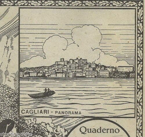 Sardegna *Cagliari: Panorama* Interessante antiche ed inusuali copertine di un quaderno d'epoca, *copertine illustrate e dedicate alla Sardegna, la copertina anteriore raffigurante una veduta panoramica di Cagliari,* ma anche un pastore sardo armato di fucile (o un brigante ?), in abito tipico popolare locale, e pure un paesaggio in cui si nota un altro tipico simbolo della Sardegna, un nuraghe; *in basso a destra due stemmi araldici, dei quali uno con al centro il simbolo del fascismo e l'altro probabilmente con le insegne araldiche locali;* *la copertina posteriore porta l'usuale tavola pitagorica, ma anche altri simboli della storia e cultura locale, con un personaggio in abito medievale che indossa una tunica con le insegne araldiche sarde, e altre illustrazioni araldiche;* il tutto probabilmente opera di artista illustratore sardo della prima metà del '900. copertine di un quaderno scolastico antico e d'epoca, misurano circa cm. 20x15; databili in epoca fascista (circa anni '30 ?) [https://img838.imageshack.us/img838/2424/sardegna7e.jpg](https://img838.imageshack.us/img838/2424/sardegna7e.jpg) [https://img233.imageshack.us/img233/1449/sardegna7f.jpg](https://img233.imageshack.us/img233/1449/sardegna7f.jpg) [https://img13.imageshack.us/img13/8321/sardegna7l.jpg](https://img13.imageshack.us/img13/8321/sardegna7l.jpg) [https://img864.imageshack.us/img864/23/sardegna7b.jpg](https://img864.imageshack.us/img864/23/sardegna7b.jpg) Di interesse artistico, storico-locale, araldico, collezionistico Modesta conservazione generale, segni e difetti d'uso e d'epoca, fioriture strappetti e difetti vari marginali, rotture al dorso, macchie varie e annotazioni; esemplare scompleto di fogli, offerta riferita alle cole copertine del quaderno originario; **meritevoli anche di essere inserite sotto passpartout ed incorniciate.** *(le immagini allegate raffigurano alcuni perticolari delle intere copertine, eventuali ulteriori informazioni a richiesta)* [](https://img838.imageshack.us/i/sardegna7e.jpg/) [](https://img233.imageshack.us/i/sardegna7f.jpg/) [](https://img13.imageshack.us/i/sardegna7l.jpg/) [](https://img864.imageshack.us/i/sardegna7b.jpg/)