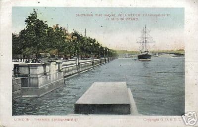 Cartolina Antica Londra Thames Embankment Nave HMS Buzzard 1900