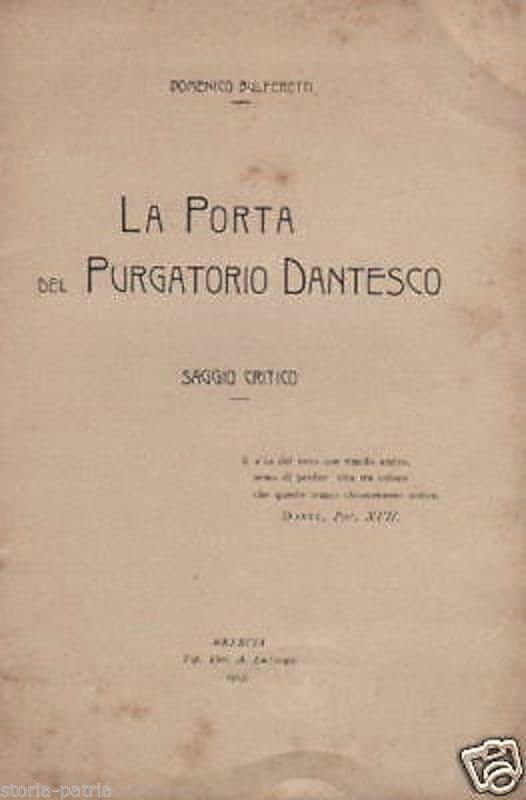 Domenico Bulferetti La porta del Purgatorio dantesco *Saggio critico* Brescia, Luzzago, 1903 Cm.18, pp. 75, bross. edit. (difetti) Interessante antica e rara edizione originale e d'epoca, opera dedicata a Don Giovanni Carettoni, dissertazione critica filologica con capitoli su *La porta di San Pietro* *A traverso l'Inferno e l'Antipurgatorio* *Il canto IX del Purgatorio* *Le varie interpretazioni* *La retta interpretazione* *Fuor del pelago alla riva* Di interesse culturale letterario specialistico bibliografico *rara edizione originale, **solo quattro esemplari noti** nel sistema bibliotecario nazionale.* Buona conservazione generale, segni e difetti d'uso e d'epoca, sgualciture a molte pagine, diffuse fioriture, copertine con annotazioni o scarabocchi e con rottura e mancanze al dorso della brossura, bollino di vecchia catalogazione personale alla copertina anteriore, eventualmente opera meritevole di rilegatura.