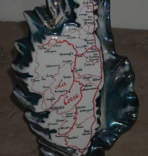 Inusuale bottiglia in ceramica di artistico modellato, a forma di isola, in particolare rappresentativa della Corsica, a margini frastagliati e con sulla facciata anteriore piana disegnata la cartografia della nota isola tirrenica, intitolata La Corse; *nella mappa sono ben evidenziati molti toponimi locali corsi, da Ajaccio a Corte, Vico, Calacuccia, Calvi, Campitello, Sartene, Portovecchio, Ghisonaccia, Bonifacio, San Nicolas, Bastia,....* *ben modellato anche il tappo sull'imboccatura della bottiglia, anch'esso in ceramica, a forma di un uccello o volatile, probabilmente un'aquila, forse simbolo storico-araldico-allegorico di questa isola francese;* misura circa cm. 28 (altezza massima, compreso il tappo) x 13 x 7 circa; marchio dorato figurato impresso sotto il fondo (porcellaine decour ?); databile presumibilmente alla metà del '900 (?); bottiglia in origine ad uso contenitore di liquore. f!!Q~~_35.JPG) Di interesse storico-locale, cartografico, decorativo, collezionistico Buona conservazione generale, usuali segni e difetti d'uso o d'epoca, bottiglia ovviamente vuota del suo originario contenuto, complessivamente buon esemplare. [](https://img824.imageshack.us/i/b5rbzqcwkkgrhqiokjqeytn.jpg/ "ImageShack - Image And Video Hosting") Uploaded with [ImageShack.us](https://imageshack.us)