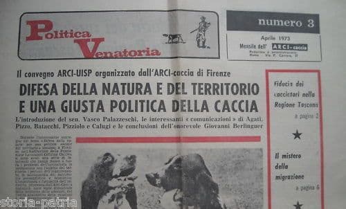 Politica Venatoria *Mensile dell'Arci-Caccia* Roma, aprile 1973 Cm.43x30 circa; pp.8; senza legatura. Interessante edizione d'epoca, giornale periodico a cura dell'Arci Caccia, dedicato alle problematiche connesse alla caccia e pesca, alla legislazione e alla storia naturale e storia-locale, con utili notizie per i cacciatori e pescatori, e in questo numero in particolare troviamo riferimenti o scritte o immagini relativi a *convegno di Firenze, con la partecipazione anche di Giovanni Berlinguer e Vasco Palazzeschi* *fiducia dei cacciatori nella Regione Toscana* *il mistero della migrazione, nuove teorie* *l'assurda opposizione del ministro Natali* *Lazio, appoggio alla proposta della Regione* *contestazioni a Genova per la fiera della caccia e pesca (campagna anticaccia)* *noi e Diana* *Terni: la riserva Casella aperta alla libera caccia* *salvare il Lago di Massacciuccoli* *morte biologica per il Tevere* *la Sicilia non deve diventare la concimaia del Mediterraneo* *il pesce dell'Arno non ha più il suo habitat naturale* *assurda sfida ai cacciatori del Comitato caccia di Rieti* *allenamento dei cani da ferma in provincia di Roma* *interessante dibattito a San Gimignano* *Arci caccia ad Alessandria* *cucina: sogliole in salsa piccante e filetti di sogliola in gelatina* *notiziario: Empoli (caccia alle quaglie), Lischeto, Casalecchio di Reno* *tiro a piattello a Isola Farnese (Roma)* *....* il tutto arricchito anche da alcune immagini illustrative. Di interesse specialistico storico-locale e bibliografico Discreta conservazione generale, segni e difetti d'uso e d'epoca, sparse fioriture, difetti vari e strappetti marginali, annotazioni, esemplare spedito per posta; senza legatura e a fogli sciolti. *(le immagini allegate raffigurano alcuni particolari della pubblicazione, eventuali altre informazioni a richiesta)* [](https://img847.imageshack.us/i/venatoria3c.jpg/) [](https://img820.imageshack.us/i/venatoria3d.jpg/) [](https://img713.imageshack.us/i/venatoria3b.jpg/)