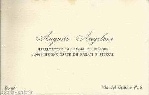 Augusto Angeloni *Appaltatore di lavori da pittore* *Applicazione carte da parati e stucchi* *Roma* Interessante vecchio biglietto da visita di un artigiano pittore-decoratore romano; misura circa cm.7x10,5; databile presumibilmente alla metà del '900 (?) Da collezione! Buona conservazione generale, segni e difetti d'uso e d'epoca, sparse fioriture o difetti vari marginali.