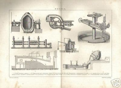 Ferro Interessante antica stampa tipolitografica, in origine edita come tavola illustrativa f.t. di una opera enciclopedica del primo '900 (anni '30 ?). Misura cm. 20x27 circa (intero foglio, a margini bianchi diseguali) Di interesse artistico, specialistico, decorativo e collezionistico Buona conservazione generale, usuali segni o difetti d'uso e d'epoca, inevitabile piegatura centrale, **meritevole di essere inserita sotto passpartout ed incorniciata.**