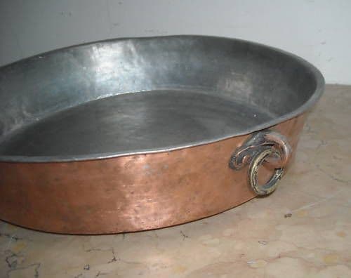 Interessante antico tegame da cucina di forma circolare o troncoconica, interamente in rame, interno stagnato, provvisto di piccolo manico laterale a cui è inserito un anello metallico in ottone (utile per poter poi appendere il tegame a parete), manico forgiato e inchiodettato a mano, *esemplare originale antico e d'epoca, di belle e utilissime dimensioni, di artistica lavorazione artigianale, modellato forgiato e inchiodettato a mano, così com'era nella tradizione della produzione artigianale dei paesi dell'Italia Meridionale, dall'Abruzzo alla Campania al Molise alla Puglia o in Calabria e Sicilia.*  Misura circa cm. 36 (massimo diametro superiore), cm. 32 (diametro della base), circa cm. 7 (altezza); esemplare interamente in rame, con antica stagnatura (la stagnatura era necessaria per il corretto e igienico e sicuro utilizzo in cucina); databile presumibilmente alla fine dell'800 (?) Utile in cucina, ma anche decorativo e da collezione *per appassionati e collezionisti di tematica su cucina e gastronomia, utensili d'epoca, antiquariato e modernariato, folklore, Meridione, arte popolare, artigianato, ....* Buona conservazione generale, usuali segni e difetti d'uso e d'epoca, superficie in patina molto ben conservata, interno stagnato, ancora nello stato originario così come rinvenuto in una vecchia soffitta di famiglia, ancora eventualmente da pulire e lucidare. [](https://img651.imageshack.us/i/b5zygvgbgkkgrhqiokjweyl.jpg/ "ImageShack - Image And Video Hosting") Uploaded with [ImageShack.us](https://imageshack.us)