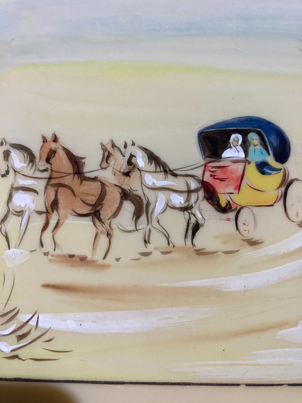 Interessante piccolo dipinto raffigurante una scena paesaggistica con una carrozza trainata da quattro cavalli, due figure sedute sulla carrozza e due figure femminili in abito d'epoca a passeggio. **Dettagli tecnici:** * **Tecnica:** Probabile tempera. * **Supporto:** Materiale plastico inusuale (lato opaco). * **Dimensioni:** Foglio 18x23,5 cm circa; parte dipinta 12,5x17 cm. * **Epoca:** Circa 1950. **Condizioni:** Esemplare in discreto stato di conservazione con segni del tempo e margini rifilati irregolarmente. L'opera è siglata in basso a destra. Precedentemente incorniciata, l'opera viene venduta senza cornice e si presta a essere montata con passepartout.