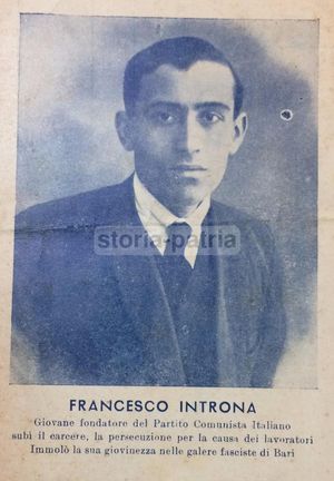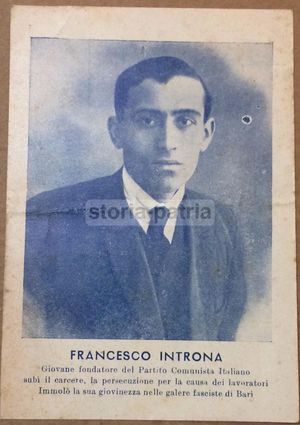 Interessante edizione di una cartolina propagandistica raffigurante il ritratto del giovane esponente del Partito Comunista Italiano. Francesco Introna, durante l'epoca fascista, fu incarcerato a Bari a seguito delle persecuzioni subite per il suo impegno a difesa dei lavoratori.
