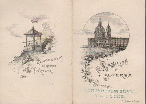 R. Basilica di Superga *Telescopio di grande portata* Interessante antico pieghevole pubblicitario, *con all'interno un avviso bilingue (italiano e francese) diretto ad informare i turisti e visitatori* *della presenza di un bazar per la vendita di souvenir o ricordi o fotografie, presso la stazione della funicolare,* *e chi avrebbe acquistato qualcosa avrebbe anche avuto l'ingresso gratuito al "panorama in rilievo delle Alpi e del Piemonte";* *pertanto, sulla copertina anteriore è presente una veduta artistica della Basilica, mentre alla copertina posteriore vi è l'immagine della stazione astronomica con ben visibile anche il telescopio;* *impressa sulla copertina anteriore è anche un rimbro pubblicitario che indica la possibilità del buffet presso la stazione di Superga;* misura circa cm. 11x15 (pieghevole disteso); il recto impresso litograficamente (Lit. Salussolia, Torino), al verso è invece impresso a stampa il suddetto "avviso"; esemplare databile presumibilemente tra fine '800 e primo '900. Di interesse storico-locale piemontese, artistico, astronomico, collezionistico Buona conservazione generale, usuali segni o difetti d'uso o d'epoca, inevitabile piegatura centrale (essendo unico foglio piegato ad uso depliant pieghevole tascabile); ***meritevole anche di essere inserito sotto passpartout ed incorniciato.***