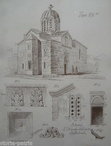 Atene *L'abside dell'antica cattedrale* Interessante antica raffigurazione di alcuni particolari architettonici o vedute prospettiche della nota città greca; *stampa litografica originale antica e d'epoca, impressa in seppia a cura dello stampatore G. Kirchmayr, da disegni del Castellazzi;* *belle dimensioni, misura circa cm. 33x24,5 (l'intero foglio, a margini bianchi irregolari o diseguali); in origine probabilmente tavola illustrativa di un'opera specialistica storico-architettonica della seconda metà dell'800 (circa 1870 ?)* Di interesse specialistico, architettonico, storico-locale, storico-artistico, decorativo, collezionistico Modesta conservazione generale, segni e difetti d'uso e d'epoca, diffuse fioriture o gore o segni di vecchio umido, comunque esemplare fascinoso nel suo evidente vissuto (stampa che ha circa 150 anni!), eventualmente **meritevole di essere inserita sotto passpartout ed incorniciata.** *(l'immagine allegata raffigura un particolare dell'intero foglio, eventuali ulteriori informazioni a richiesta)*