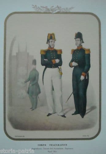 CORPO TELEGRAFICO *SEGNALATORE* *TENENTE COLONNELLO COMANDANTE* *CAPITANO* *(NAPOLI, 1855)* Interessante e bella raffigurazione a colori, *di custumi militari dell'epoca borbonica, immagine molto realistica che ben evidenzia le uniformi di tre tipi particolari del corpo dei telegrafisti, nei simboli e colori dell'epoca, con anche visibile un segnalatore nei pressi di un grande macchinario (telegrafo?);* stampa a colori, con anche bordino dorato e cimasa allegorica, da disegno di A. Di Lorenzo, reprint della nota edizione napoletana ottocentesca litografata dallo Zezon; belle grandi dimensioni, misura circa cm. 43x32 (l'intero foglio, compresi i margini bianchi diseguali), databile presumibilmente alla metà del '900. DI INTERESSE STORICO-MILITARE, BORBONICO, RISORGIMENTALE, STORICO-LOCALE NAPOLETANO, COLLEZIONISTICO, DECORATIVO Buona conservazione generale, segni e difetti d'uso e d'epoca, difetti vari marginali o sparse fioriture, **meritevole di essere inserita sotto passpartout ed incorniciata.** *(l'immagine allegata raffigura un particolare dell'intero foglio, ossia la parte centrale figurata, eventuali ulteriori informazioni a richiesta)* *####* *(disponibilità di altri soggetti della stessa serie, con altri costumi militari borbonici, ulteriori informazioni a richiesta)*