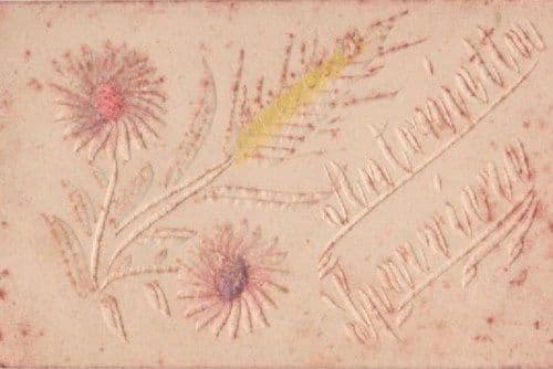 Interessante antico inusale Piccolo cartoncino leggero, formato cartolina postale, con al recto intagliato il nome e cognome probabilmente dell'antico autore, Antonietta Sparviero, *forse esemplare anche ad uso di biblietto da visita o augurale, con raffigurazione anche di una spiga di grano (?) e due fiori, questi con delicata coloritura a mano,* il tutto bell'esempio di artigianato artistico dell'epoca, nei modi anche degli intagli che usavano fare le nostre antiche ricamatrici, *esemplare di provenienza pugliese (Gargano) e pertanto molto probabilmente eseguito da una artista locale;* cartoncino di carta leggero, di circa cm. 9x14 (formato utile anche quale cartolina ad uso postale, ma nessuna scritta al verso), antico e d'epoca, inciso e intagliato al recto (tecnica che permetteva di incidere la superficie e sollevare i lembi in maniera tale da ottenere scritte calligrafiche o immagini decorative); databile in epoca liberty, ossia primo '900. Di interesse specialistico e collezionistico Buona conservazione generale, usuali segni e difetti d'uso e d'epoca, diffuse fioriture, **meritevole anche di essere inserito sotto passpartout ed incorniciata.**