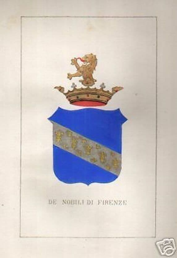 Bellissima illustrazione delle armi nobiliari con simbologia allegorica nel ricco blasone, relativa alla casata toscana dei De Nobili di Firenze Litografia originale antica e d'epoca, acquarellata a mano, anche con dorature, databile circa 1870-1880. Di interesse storico artistico culturale araldico e collezionistico Misura cm. 33,5x24 ca. (foglio, stemma al centro e ampi margini bianchi diseguali); buona conservazione generale, usuali segni d'uso e d'epoca; **meritevole di essere inserita sotto passpartout ed incorniciata.**