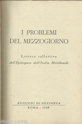I problemi del Mezzogiorno *Lettera collettiva dell'Episcopato dell'Italia Meridionale* Roma, Presenza, 1948 Cm.20, pp. 52, bross. edit. (difetti) Interessante edizione d'epoca, che vuole essere testimonianza della passione della Chiesa nei confronti della questione meridionale, e a un preambolo iniziale segue *I problemi del Mezzogiorno, esigenza di giustizia, la crisi attuale;* *Principi e direttive, proprietà terriera, rapporti contrattuali, condizione dei braccianti, elevazione spirituale del lavoratore;* *I mezzi, diffusione del pensiero cristiano, difesa della verità e della libertà, opera dello Stato, doveri dei cattolici, riforma del costume e iniziativa privata, collaborazione delle Classi e Associazioni dei Lavoratori, opere economiche e sociali,...* Di interesse culturale e bibliografico Buona conservazione generale, segni e difetti d'uso e d'epoca, sparse fioriture e difetti vari marginali, ma esemplare ancora a fogli chiusi.