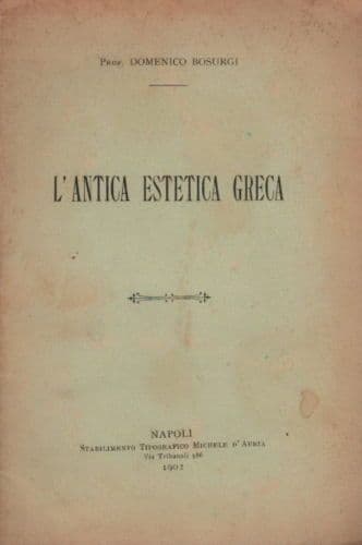 Domenico Bosurgi L'antica estetica greca Napoli, D'Auria, 1902 Cm.23,5; pp. 34; bross. edit. Interessante e rara edizione originale e d'epoca, con gustosa dissertazione relativa al concetto di bellezza, e di bello nell'arte, e l'estetica nell'antica Grecia, con capitoli su: *I filosofi naturalisti, i sofisti, Socrate* *La teoria del bello secondo Platone* *Concetto platonico dell'arte* *I socratici e i platonici, il commediografo Aristofane, Aristotile, suo concetto del bello e del buono* *I tre gradi della bellezza* *Rapporto del bello col buono* *Concetto aristotelico dell'arte imitativa* *La fantasia, la distinzione delle arti belle, l'arte rispetto alla vita sociale* *La filosofia estetica dopo Aristotile fino a Plotino* *Le vedute filosofiche di Plotino, il bello rispetto all'assoluto bene e alla materia* *Il bello oggettivo e il bello artistico* *Gli ultimi epigoni della estetica antica, gli inizi della moderna scienza del bello e dell'arte* Di interesse culturale artistico filosofico bibliografico *Rarissima edizione, **un solo esemplare noto** nel sistema bibliotecario nazionale.* Buona conservazione generale, usuali segni o difetti d'uso o d'epoca, sparse fioriture in particolare alle copertine.