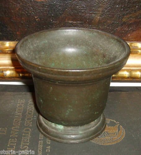 Indispensabile all'erborista Immancabile nella bottega del farmacista Utilissimo in cucina Antico mortaio in metallo massiccio, di belle giuste dimensioni, di pratica utilità, utile per triturare erbe aromatiche o medicinali o piante officinali, *ma anticamente usualmente utilizzato anche in cucina, per il tipico pesto o per macinare alimenti vari o essenze;* *magnifico esemplare antico e d'epoca, bel modellato e in bellissima patina scura!* Misura circa cm. 9,5 (altezza), apertura circa cm.11,5 ; in metallo scuro massiccio, probabilmente bronzo, ancora in patina, databile presumibilmente alla metà del '700 (?). Decorativo e da collezione! Buona conservazione generale, segni e difetti d'uso e d'epoca, usuale diffusa ossidazione, ancora eventualmente da pulire e lucidare (ma salvaguardando la patina originaria), il tutto così come dalle immagini allegate, ancora così come rinvenuto in una antica collezione di famiglia *(uno di una collezione privata di mortai, in bronzo e in pietra o marmo; eventuali ulteriori informazioni a richiesta)*