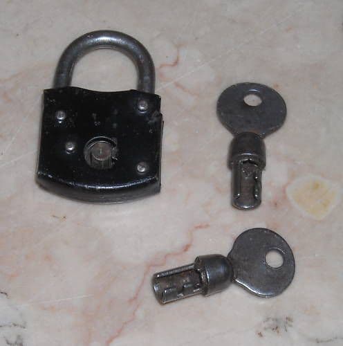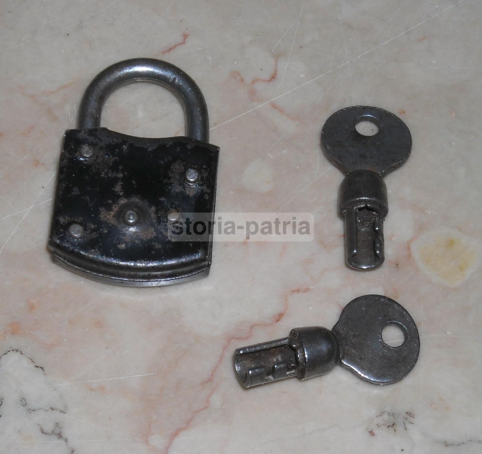 (Lucchetto d'epoca) Interessante mini lucchetto, corredato da due mini chiavi di inusuale lavorazione, di tipologia quasi simile alle chiavi di sicurezza, funzionante; *esemplare da collezione!* *utile anche per chiudere piccoli scrigni, o salvadanai o valigette o borsette, così come spesso era uso in passato;* misura circa cm-3,3x2x0,6 ; in ferro laccato nero e cromatura; nessun marchio di fabbrica visibile; databile probabilmente all'inizio del '900 (circa anni '20 ?) Inusuale e da collezione Discreta conservazione generale, segni e difetti d'uso e d'epoca, usuale sparsa ossidazione e abrasioni e segni di usura e difetti vari marginali o così come visibili nelle immagini allegate; oggetto funzionante e provvisto di una coppia di chiavi (due graziose e mini chiavi), ancora nello stato così come ritrovato in una vecchia soffitta di famiglia, così come visibile nelle immagini allegate. *(le immagini allegate raffigurano alcuni particolari dell'intero oggetto, eventuali ulteriori informazioni a richiesta)*