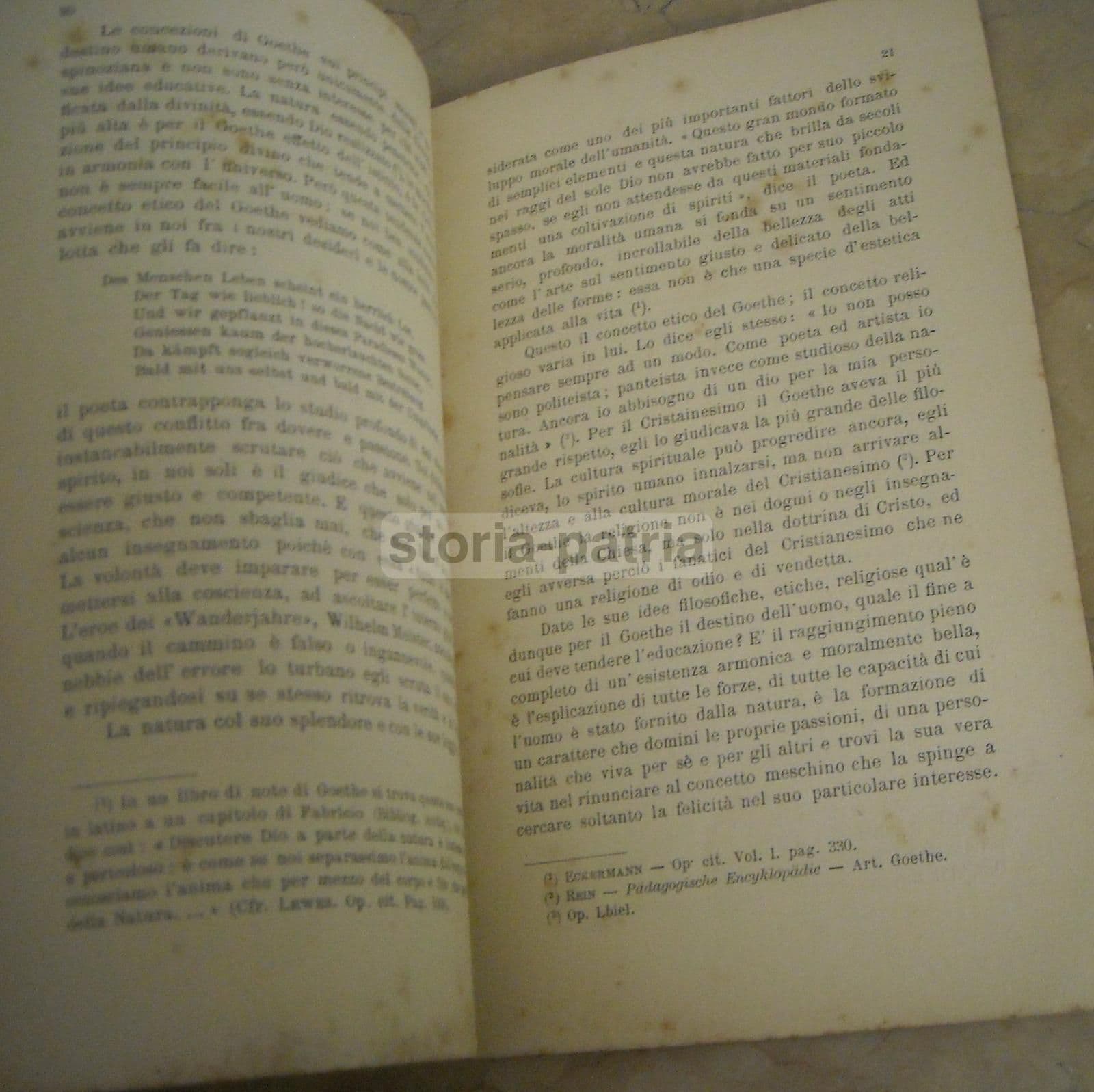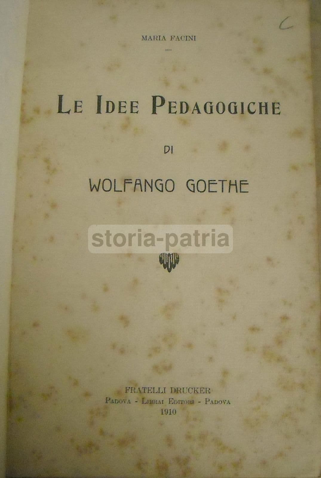 Maria Facini Le idee pedagogiche di Wolfango Goethe Padova, Drucker-Librai, 1910 Cm.22, pp.56, bross.edit. (difetti) Interessante edizione antica e d'epoca, dissertazione intorno alle teorie pedagogiche di Goethe, delle quali si trova traccia un pò in tutte le sue opere e soprattutto nella sua autobiografia; *in questo libro sono pertanto ripercorse le diverse fasi della sua vita e ricordate le persone che gli furono di guida e d'esempio;* *esaminate le influenze che su di lui ebbero Spinosa, Kant, Rousseau, Key... la sua ammirazione per la classicità...l'importanza data alla dialettica...il suo amore per i viaggi.* Di interesse specialistico, pedagogico, filosofico, bibliografico *rara edizione, attualmente due soli esemplari noti nel sistema bibliotecario nazionale.* Buona conservazione generale, segni e difetti d'uso e d'epoca, diffuse fioriture e difetti vari marginali. *(l'immagine allegata raffigura un particolare della copertina anteriore, eventuali ulteriori informazioni a richiesta)*