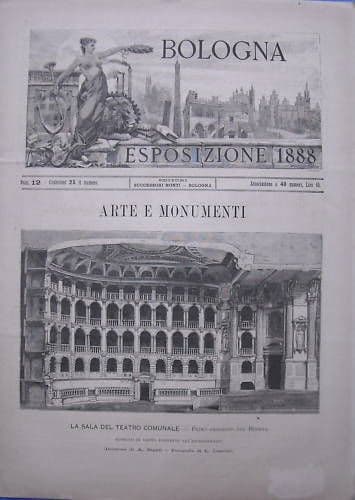Bologna *Esposizione 1888* Bologna, Monti, 1888 N. 12 Cm. 38x27, pp. (da pag.89 a pag.96), senza legatura. Interessante edizione originale antica e d'epoca, pubblicazione periodica diffusa in concomitanza della nota manifestazione d'arte bolognese del 1888, della quale era anche una espressione della cronaca e degli avvenimenti, fascicolo per fascicolo venivano presentati artisti e opere d'arte, di pittura o scultura, o arti minori varie, ogni fascicolo con numerazione progressiva delle pagine, mediamente 8 pagine per fascicolo, usualmente anche illustrati; *ogni fascicolo inoltre è arricchito da una ampia ed artistica illustrazione della testata, una allegoria in cui sono raffigurati alcuni dei principali monumenti bolognesi o romagnoli o emiliani, ciminiere fumanti di industrie, una giovane fanciulla seminuda che regge una corona di alloro, uno stemma araldico, tavolozza e colori simbolo della pittura, strumento musicale simbolo della musica, compasso e martello, e altra simbologia tutta volta ad indicare le varie arti e la cultura, compresa la scultura e l'architettura, con anche un leone che sdraiato poggia una sua zampa su grossi libri,....illustrazione a firma G. Lolli (o Lotti ?), e incisa da Cantagalli (?).* In questo unico fascicolo disponibile troviamo scritti e immagini relativi a: *Arte e monumenti: La sala del Teatro Comunale: primo progetto del Bibiena, modello in legno esistente nell'Archiginnasio (incisione di A. Bigatti, Foto di L. Lanzoni) (illustrazione in copertina anteriore)* *L'Università* *Il Palazzo della Musica* *Ferrara moderna* *Vecchi teatri in Bologna (con illustrazioni del Teatro alla Scala nel 1693 e nel 1722, immagini tratte da miniature conservate nell'Archivio di Stato)* *Parte ufficiale: VIII centenario dello Studio Bolognese: atti del Comitato, rappresentanti,....* : *Cronaca: notizie varie inerenti le varie manifestazioni bolognesi (mostre alpine e affini, industria, Cecioni, Vertunni,...)* *Ritratti: Luigi Bombicci Porta, Pietro Loreta (due immagini incise sull'ultima pagina);* *nel doppio paginone centrale è impressa (su unico grande foglio) una veduta del Palazzo della Musica, bella veduta animata da numerosissime persone o visitatori, opera progettata dall'architetto F. Buriani e illustrata dall'artista A. Sezanne.* Di interesse storico-locale, artistico, collezionistico, bibliografico *pubblicazione utilissima a collezionisti d'arte italiana dell'Ottocento, e ad appassionati e collezionisti di ceramica e maiolica italiana o emiliana romagnola.* Buona conservazione generale, usuali segni o difetti d'uso e d'epoca, sparse fioriture o sgualciture o difetti vari marginali, esemplare a fogli sciolti, **le belle illustrazioni potrebbero anche essere inserite sotto passpartout ed incorniciate distinatamente.** *(le immagini allegate raffigurano alcuni particolari dell'intera pubblicazione, eventuali altre informazioni a richiesta)* [](https://img811.imageshack.us/i/bthehk2kkgrhqmhdcevfitn.jpg/ "ImageShack - Image And Video Hosting") Uploaded with [ImageShack.us](https://imageshack.us)