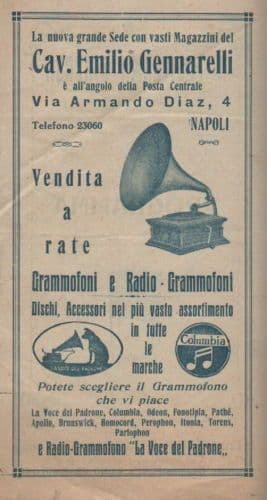 R. Politeama Giacosa Programma .... Interessante antico pieghevole, pubblicitario degli spettacoli del noto Politeama napoletano, con in programma il concerto del "*celebre violinista Ferenc de Vecsey",* accompagnato al piano da Guido Agosti; *ma pubblicizzato anche il prossimo debutto della Compagnia Drammatica Ermete Zacconi con "Il Cardinale Lambertini";* a piena pagina è una pubblicità della ditta musicale napoletana Gennarelli, con i marchi della Columbia e della Voce del Padrone, e raffigurato un antico grammofono a tromba, uno degli strumenti musicali che la ditta vende nel suo negozio di Napoli, oltre a radio (e infatti in prima pagina è raffigurata anche una "Radiola 44"); *infine in quarta pagina è sempre una pubblicità della Gennarelli per l'acquisto a rate di una "macchina parlante".* Misura circa cm. 23x12,5 (pieghevole chiuso); impresso a Napoli dalla Coop. Tip. Sanitaria, databile 1931 (data del concerto del violinista); con anche piccolo stemma di casa Savoia all'intestazione. Di interesse storico-locale, pubblicitario, musicale, bibliografico Discreta conservazione generale, segni e difetti d'uso e d'epoca, sgualciture varie e piegature e strappetti marginali, annotazioni manoscritte, **meritevole anche di essere inserito sotto passpartout ed incorniciato.** *(le immagini allegate raffigurano un particolare dell'intera pubblicazione)* ##### Ampia disponibilità di fogli volanti, pieghevoli, programmi di manifestazioni musicali o teatrali napoletane della prima metà del '900 *(eventuali altre informazioni a richiesta)*
