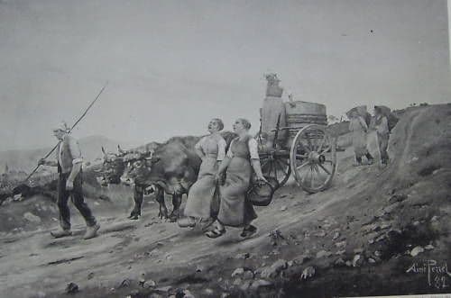 Vendanges de Bourgogne Interessante antica e decorativa veduta raffigurante alcuni contadini nelle campagne francesi della Borgogna, con il loro carico di preziose uve, durante la stagione della vendemmia, *con visibile anche un carretto trainato da buoi e due festose fanciulle con i cesti in mano che precedono il carretto con i loro canti,* e sul carretto -in piedi- una contadina anziana appoggiata ad un grosso tino, e dietro il carretto ancora altri due contadini con sulle spalle i loro cesti per la raccolta dei grappoli d'uva; *stampa antica e d'epoca, impressa in fototipia, edita in Parigi verso la fine dell'800,* *immagine a stampa tratta da un dipinto dell'artista francese Aimè Perret (1882);* misura circa cm. 32x45 (l'intero foglio, compresi i larghi margini bianchi diseguali; cm. 16,5x25 la sola parte figurata) Di interesse artistico, specialistico, collezionistico, decorativo Discreta conservazione generale, segni e difetti d'uso e d'epoca, fioriture macchie strappetti e sgualciture varie marginali, **meritevole di essere inserita sotto passpartout ed incorniciata** *(l'immagine allegata raffigura un particolare dell'intero foglio)*