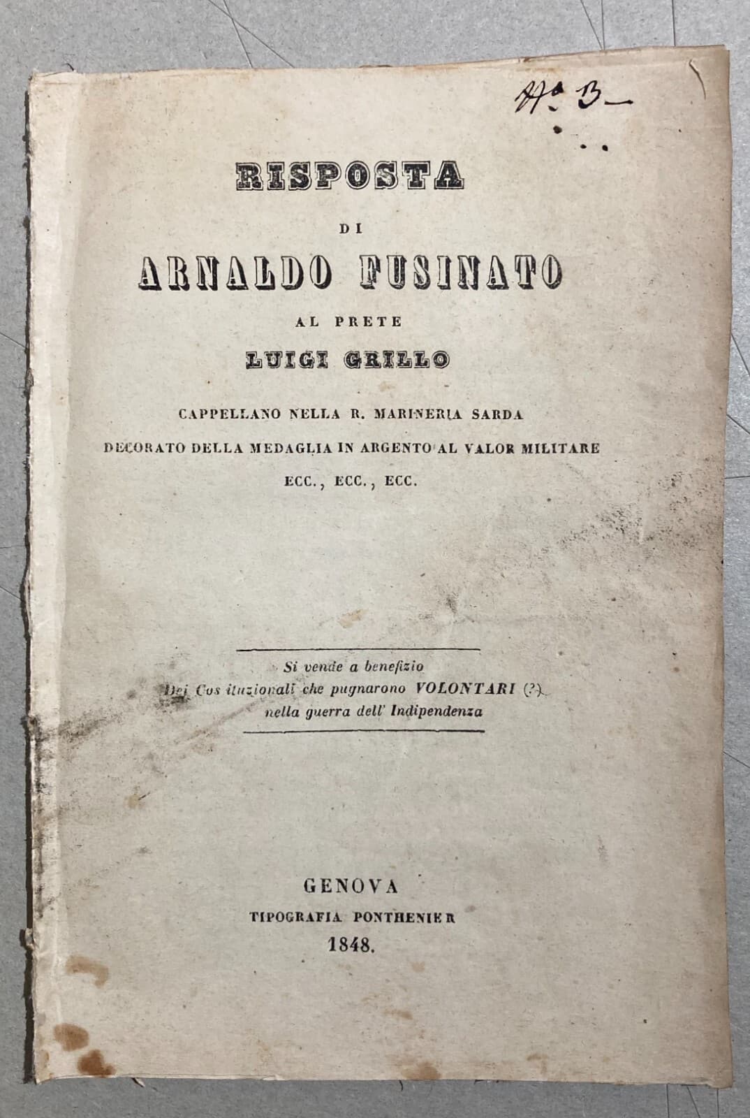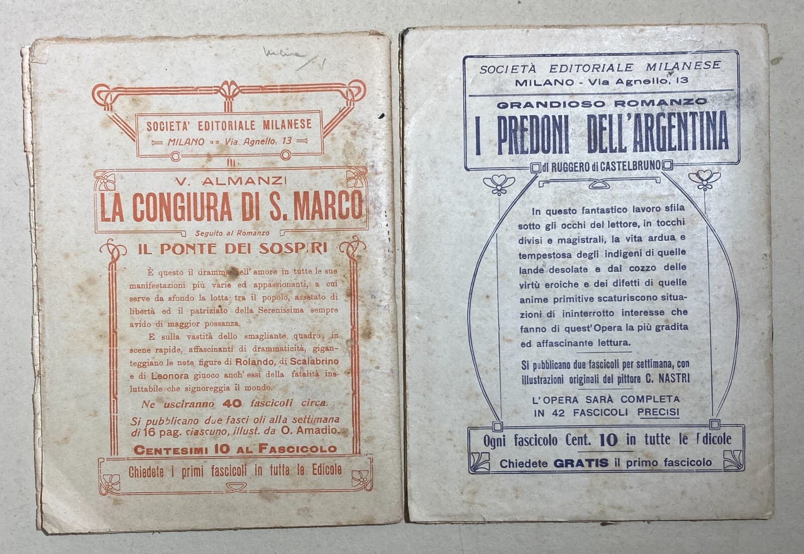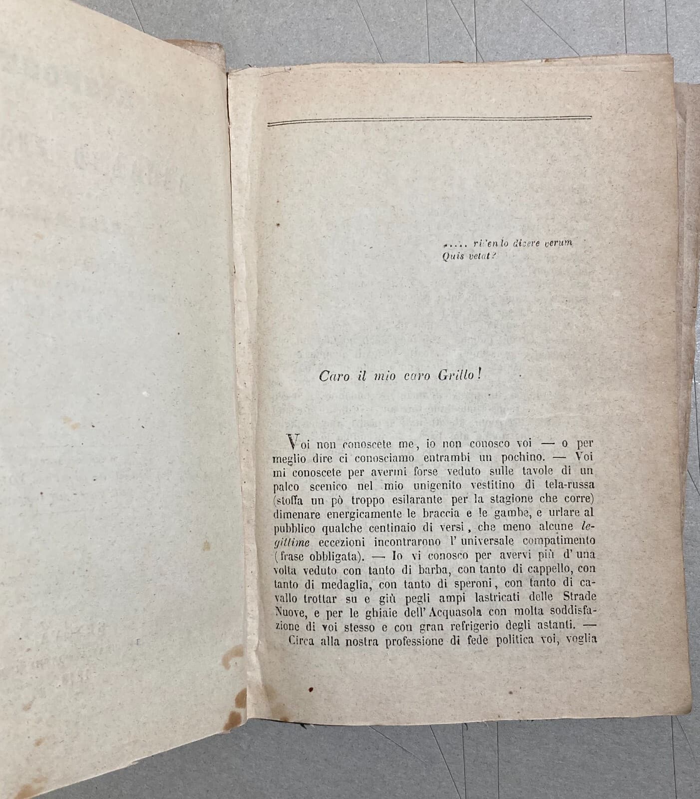 **Rabindranath Tagore**, *Il dono dell'amante e Passando all'altra riva*. *Lanciano*, **Carabba**, 1920. Volume in ottavo (cm 17,5), pp. 120, con legatura in tela editoriale rigida, titoli e fregi dorati impressi al dorso. Traduzione a cura di **E. Taglialatela**. Edizione impressa dalla celebre casa editrice abruzzese **Carabba** di *Lanciano* (*Chieti*). L'opera contiene un'ampia raccolta di componimenti poetici e filosofici del premio Nobel indiano. Il volume presenta fregi artistici decorativi al frontespizio e all'antiporta. Provenienza: Note di possesso manoscritte coeve di famiglie pugliesi (**Vaccarella** e **Jannuzzi**). Stato di conservazione: Discreto. Segni d'uso e del tempo alla legatura, fioriture sparse, bruniture cartacee e annotazioni marginali. Difetti visibili come da documentazione fotografica.