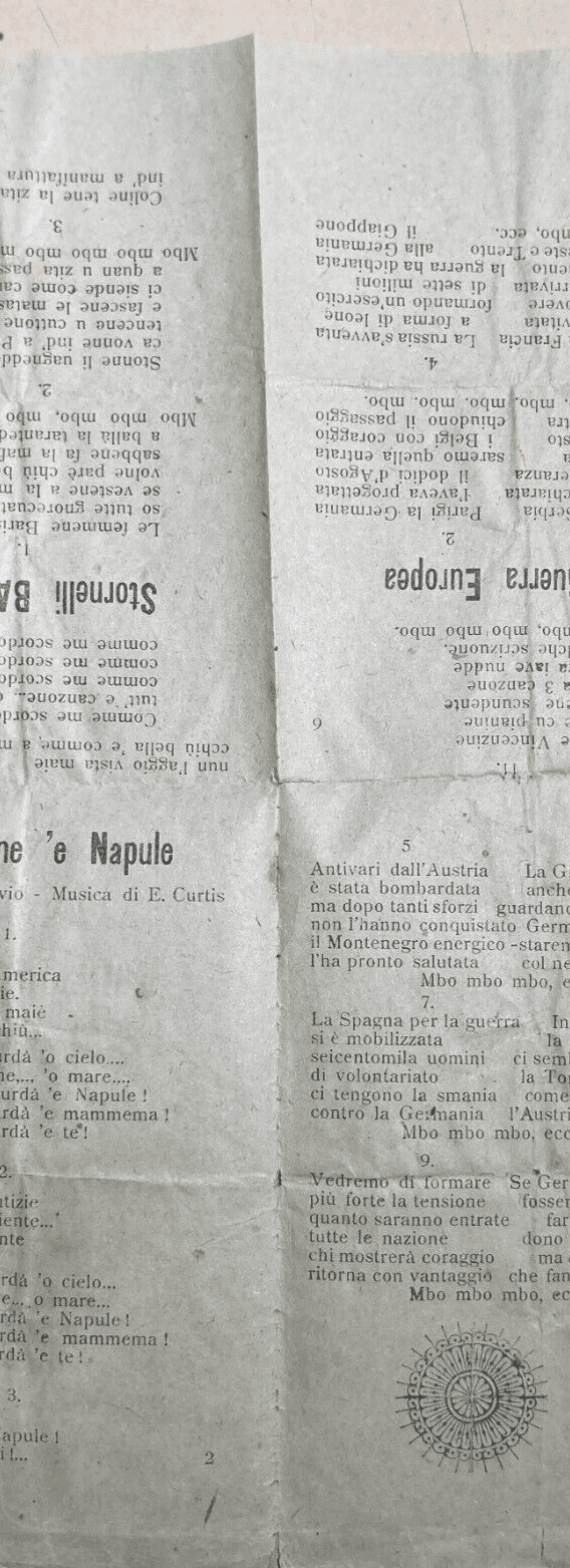 **Nuove canzoni popolari**. Interessante edizione antica d'epoca sotto forma di foglio volante, impresso su entrambi i lati. Contiene i testi di celebri composizioni popolari e dialettali: * **A Canzone 'e Napule** (versi di **Libero Bovio**, musica di **E. Curtis**) * **Stornelli Baresi** * **L'ammore nelle stagioni** * **La guerra europea** (riferimento alla Prima Guerra Mondiale) Il foglio misura circa 31x20,5 cm, originariamente concepito per essere ripiegato in un formato tascabile di otto pagine. Privo di indicazioni tipografiche, è databile ai primi anni del Novecento. *Stato di conservazione*: Esemplare con evidenti segni del tempo, fioriture, bruniture, pieghe e piccoli strappi marginali.