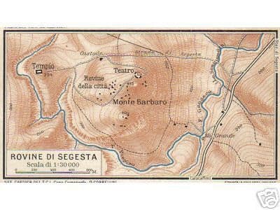 Interessante antica mappa topografica **Rovine di Segesta Provincia di Trapani** **Importante sito archeologico nella regione Sicilia** Stampata da Vallardi (Milano) nei primi anni del '900 su disposizione del TCI per una guida turistica e di viaggio. Dimensione intero foglio cm. 10,5 x 6 circa; ottima conservazione generale (usuali bruniture della carta). * * * **Di interesse storico, artistico, geografico e collezionistico**