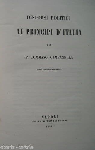(P. Garzilli) Discorsi politici ai principi d'Italia *del P. Tommaso Campanella* *....* Napoli, Stamperia del Fibreno, 1848 Cm.28,5; pp. 37, cartonato edit. Interessante edizione antica e d'epoca, elegante fresca pubblicazione a cura del Garzilli, con i *"Discorsi ai principi d'Italia, che per loro bene e del Cristianesimo non debbono contradire alla monarchia di Spagna, e come dal sospetto di quella si possono guardare nel Papato, e per quella contro gl'infedeli";* complessivamente dodici "discorsi", di impossibile sintesi, ma con riferimenti o citazioni relative a: *Italia, Chiesa Apostolica, Roma, Arabi, i Turchi, Grecia, Normanni, Francesi, Costantinopoli, Cipro, Sicilia, Napoli, Alcorano, Sardegna, Duca di Savoja, Duca di Urbino, Romagna, Umbria, Genova, Liguria, regno di Corsica, Marche, Ferrara, Polibio, Cartaginesi, Svevi e Angioini, Istria, Dalmazia, Giudea Palestina, Gerusalemme, scismi apostasie eresie, Etipia, Africa, l'impero di Spagna, Catalogna, Portogallo, Maiorca, Minorica, Castiglia, Giovanni da Procida, Lattanzio Firmiano, Pietro in Castiglia, Messia, Federico Re di Napoli, Ferdinando d'Aragona, re di Navarra, Carlo Quinto, ....* *"...vero rimedio è di fare in Roma un Senato comune a tutti i principi cattolici, nel quale abbiano voce tutti i principi con i loro agenti, ed ognuno possa avere un cardinale di più fatto a sua divozione, e che il Papa entri come capo con un suo collaterale...."* Di interesse storico-locale, culturale, bibliografico *rara edizione d'epoca, **solo pochi esemplari noti (sei)** nel sistema bibliotecario nazionale italiano.* Buona conservazione generale, usuali segni e difetti d'uso e d'epoca, legatura un pò allentata, ma complessivamente fresco esemplare, ben conservato e in buona legatura coeva.