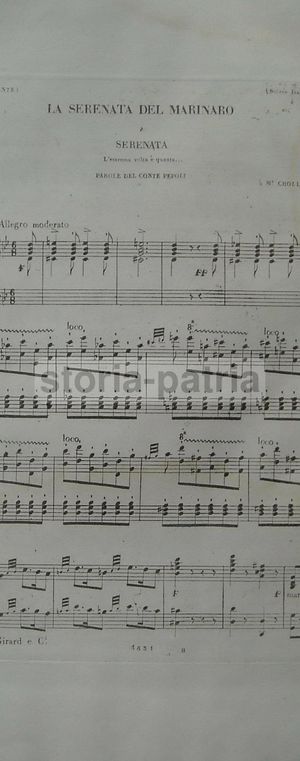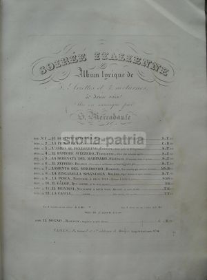 Interessante edizione d'epoca, spartito musicale estratto dalla raccolta Soirée Italienne: Album Lyrique de Ariette et Nocturnes a Deux Voix. Composto da Saverio Mercadante su testo del Conte Pepoli e dedicato a M. Chollet.