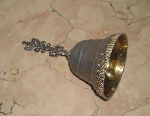 Graziosa piccola campana *campanellina in metallo, con decorazione in rilievo lungo il bordo inferiore, e con artistico manico raffigurante motivi vari vegetali o artistici;* misura circa cm. 11 (altezza totale), circa cm.4,5 (altezza della sola campana); in metallo giallo, probabilmente ottone o lega simile; provvista del suo batacchio e pertanto ben funzionante; databile presumibilmente alla metà del '900. Decorativa e da collezione Buona conservazione generale, segni e difetti d'uso e d'epoca, diffusa ossidazione, meritevole di pulitura o lucidatura per meglio esaltare la sua originale brillantezza. *(l'immagine allegata raffigura un particolare dell'intero oggetto, eventuali altre informazioni a richiesta)*