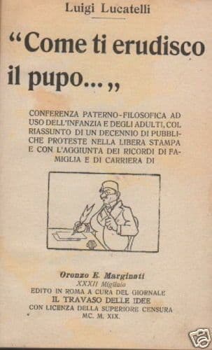 LUIGI LUCATELLI (ORONZO E. MARGINATI) COME TI ERUDISCO IL PUPO... *CONFERENZA PATERNO-FILOSOFICA AD USO DELL'INFANZIA E DEGLI ADULTI, COL RIASSUNTO DI UN DECENNIO DI PUBBLICHE PROTESTE NELLA LIBERA STAMPA E CON L'AGGIUNTA DEI RICORDI DI FAMIGLIA E DI CARRIERA DI* *ORONZO E. MARGINATI* Roma, Il Travaso delle Idee, 1919 Cm.17,5; pp. 221; vecchio cartonato d'epoca. Interessante edizione originale e d'epoca, opera di un letterato italiano noto per la sua arguzia, e per i suoi scritti satirico-umoristici, che meglio si esprimono in questa pubblicazione probabilmente la più conosciuta dell'autore, un omaggio alla memoria dell' autore scomparso, a cura della redazione del celebre giornale Il Travaso OPERA ARRICCHITA DAL RITRATTO A PIENA PAGINA DELL'AUTORE E DA NUMEROSE ILLUSTRAZIONI VIGNETTISTICHE SATIRICO-UMORISTICHE DI SCARPELLI, FINOZZI E GUASTA Scorrendo i vari capitoli: *CONFERENZA* *QUELLA COSA CHE CHIAMENO MORALE PULITICA* *CON VIVA PREGHIERA DI SALUTARMI TANTO MONTECITORIO E ANNESSI INCOMMODI* *IO, GARIBBALDI E GUGLIELMONE* *COME MI LAVORO L'AEDO* *QUELLO CHE MI ARICORDO DE LE COSE MIE* *TI DEMOLISCO IL NOVO MONTECITORIO* *CONTRO LO SCOPATORE IRRIPIRIBILE* *L'ARITTIMETTICA DELLA NAZZIONE* *TEORIA DE LA CAROGNA SOLITARIA* *TI ANNICHILISCO IL FUTURISMO* *SULLA COMMUNICAZIONE DELLE SIGNORINE CHE NON TE LA DANNO* *IL CAROVIVERI* *SULLA PENURIA DEI DICASTERI* *TI ACCUSO CORRADO BRANDO* *AL VATE NELLA VIGGILIA DEL CIMENTO* *.....* OPERA DI INTERESSE CULTURALE POLITICO BIBLIOGRAFICO Discreta conservazione generale, segni e difetti d'uso e d'epoca, due carte con strappi sommariamente riparati, sparse fioriture, opera con modesta legatura, meritevole di migliore rilegatura.