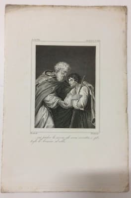 (Madonna con bambino) nel monastero di Sancta Maria Maddalena di Giosafat. Antica edizione con immagine della Madonna col bambino in braccio (Madonna del latte), iconografia devozionale di un altare siciliano. * **Autore:** **Placido Doni** (Messina, fine XVIII - inizio XIX secolo). * **Tecnica:** Incisione originale all'acquaforte. * **Dimensioni:** Foglio circa 34x22 cm; parte figurata circa 20x12 cm. * **Epoca:** Fine del XVIII secolo. * **Stato di conservazione:** Discreta conservazione generale con fioriture diffuse, pieghe e segni del tempo; presenti tracce di ricalco (ghosting) da fogli di testo originariamente adiacenti.