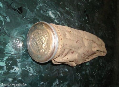 Superproof **Interessante antica borsa ad uso sanitario, probabilmente per essere riempita di acqua calda per applicazioni mediche-terapeutiche,** **prodotta dalla Superproof, così come da marchio impresso sul tappo metallico svitabile;** **in tessuto (probabilmente impermeabile), misura circa cm.28 (lunghezza totale); databile prima metà del '900.** Di interesse medico sanitario collezionistico Discreta conservazione generale, segni e difetti d'uso o d'epoca, diffuse fioriture o macchie di vecchia ossidazione, segni di ossidazione anche al tappo metallico; il tutto così come dalle foto allegate, così come rinvenuta in una vecchia soffitta di famiglia; non verificata e pertanto non garantita l'integrità e la funzionalità.